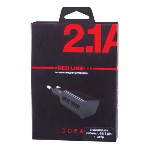 Зарядное устройство сетевое (220 В), RED LINE NT-2A, кабель для IPhone (iPad) 1 м, 2 порта USB, выходной ток 2,1 А,черное, УТ000012286 ОЗ